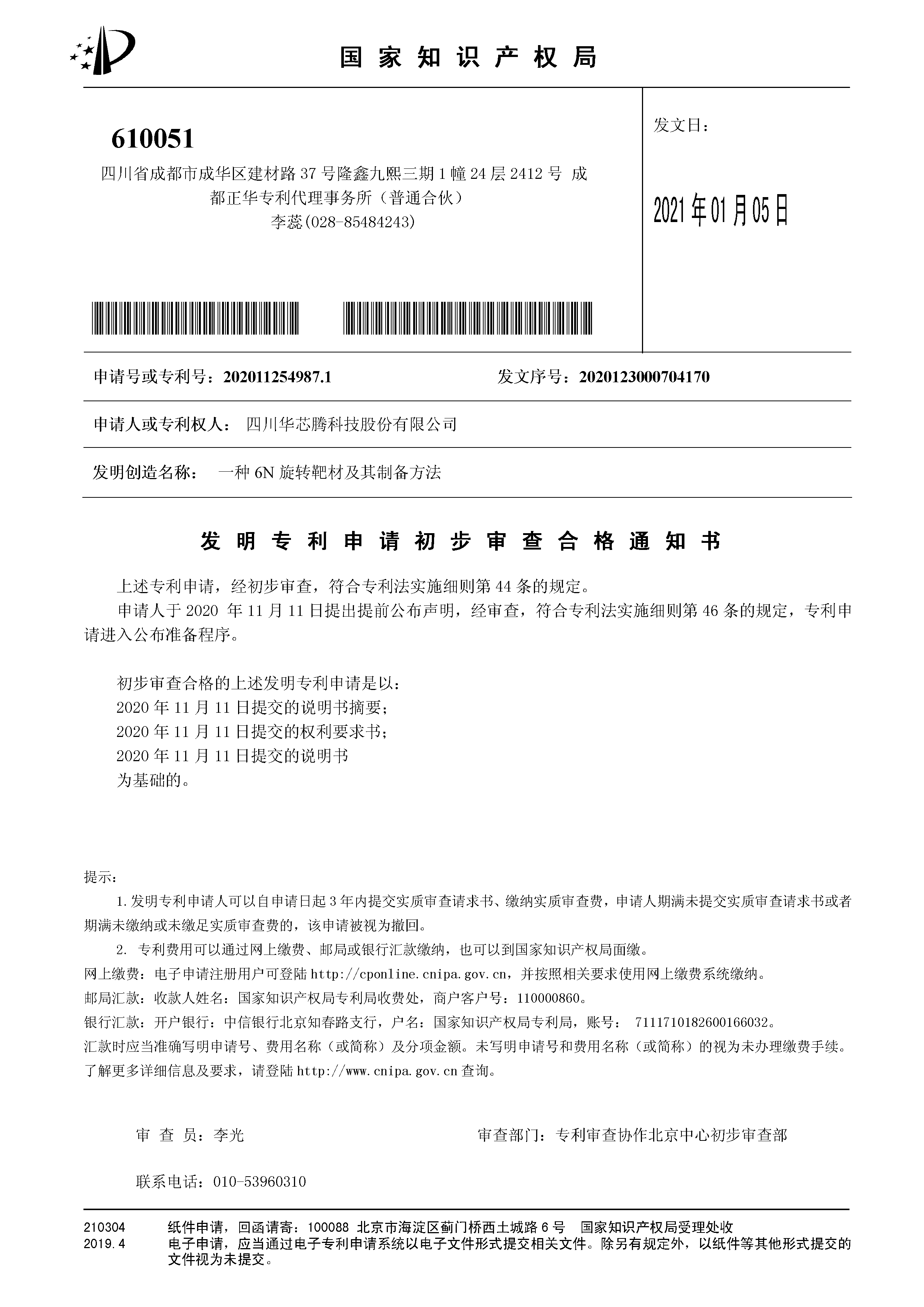 四川华芯腾科技股份有限公司近日向国家知识产权局提交【一种6N旋转靶材及其制备方法】的专利申请(申请专利号:202011254987.1),经审查,该专利申请符合专利法实施细则第46条规定, 专利申请进入公布准备程序。